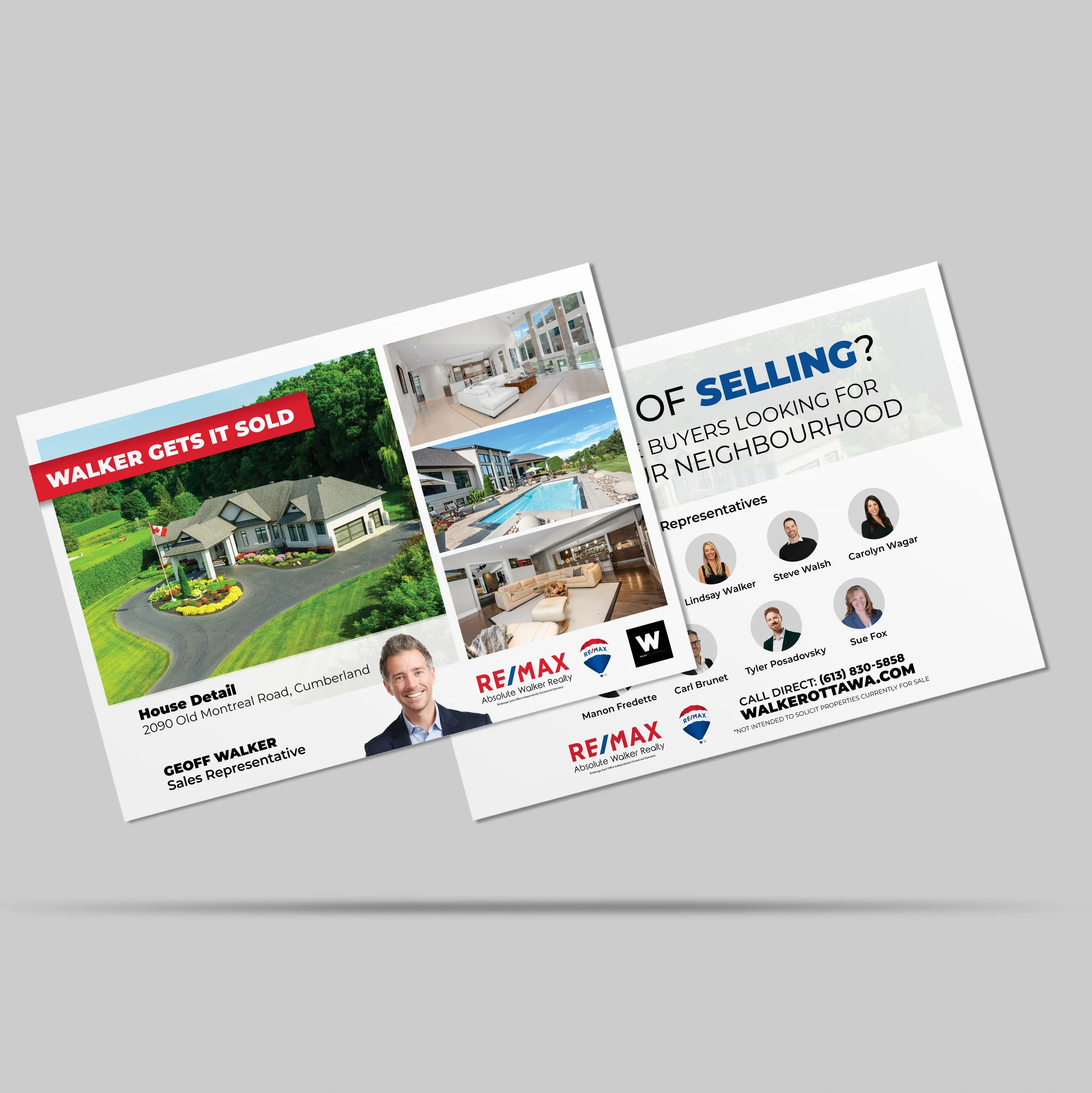 Additional work includes flyers for Walker Real Estate Group, highlighting a property sold on Old Montreal Road, along with standard promotional flyers.